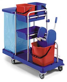 Con base de plástico, suplemento base bolsa, 2 bandejas centrales, 2 cubos de 12 litros, 1 soporte prensa, 1 cubo de 25 litros, 1 prensa plástico, tubo rilsanizado, 1 soporte mopa, 1 gancho portaescoba, portabolsa de 120 litros rilsanizado, ruedas de 100 mm.