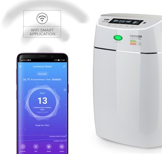 Nueva versión wifi - Purificador de aire FAKIR LUMINOSO SMART HEPA14 < 50 m2Incluso en los hogares más limpios, el aire interior a menudo está contaminado con más contaminantes y alérgenos que el aire exterior. Equipado con 6 tecnologías de filtro de alto rendimiento, Luminoso elimina hasta el 99,995 % del polvo, los olores, el humo, el polen, formaldehído y otros contaminantes desde un tamaño de solo 0,1 micrones. Un sensor de polvo y olor informa sobre la calidad del aire actual mediante una luz de cambio de color y regula el flujo de aire en consecuencia.